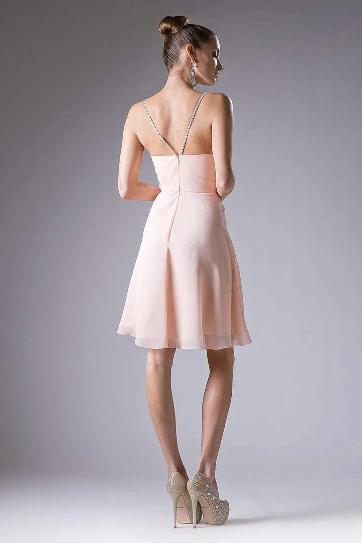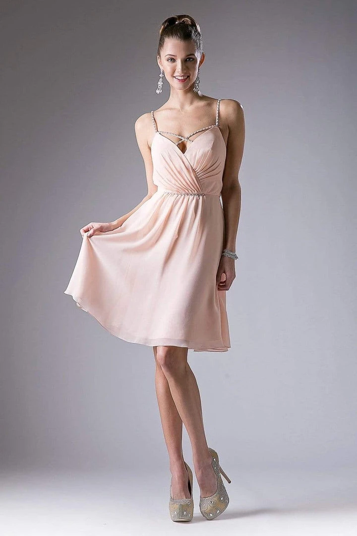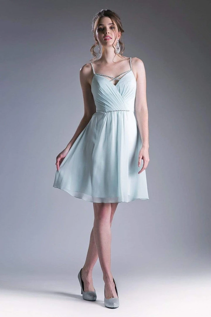 Look fresh and pretty in this dress by Cinderella Divine 1009. Fashions a sleeveless, beaded spaghetti straps and a pleated bodice. The back has a zipper closure while the chiffon skirt flares a flowy A-line silhouette in mid-thigh hem. This Cinderella Divine creation is simply perfect for your next formal party!