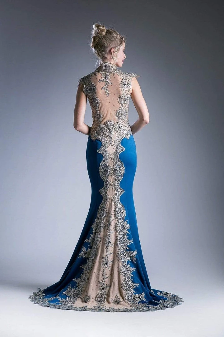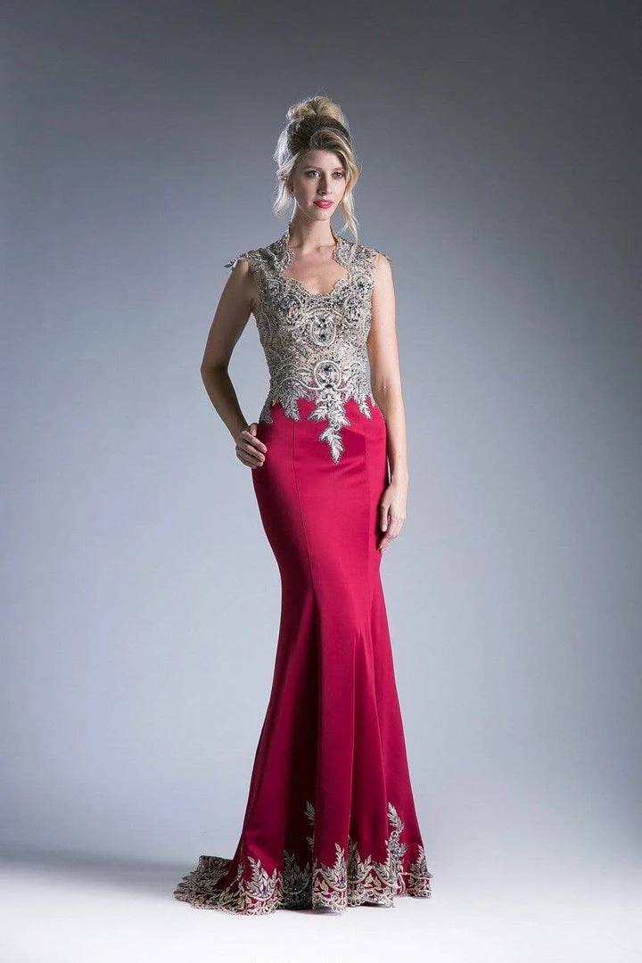 Mesmerize like you have never done before when you slip on this exquisite Cinderella Divine 7263 creation. Adorned with iridescent rhinestones sprinkled on gilded lace appliques on a nude bodice, this regal piece shows a Queen Anne neckline draped with cap sleeves. Beautifully scalloped with exceptional lace trailing the illusion back, the mermaid skirt reveals a nude back panel trailing down the back. A sophisticatedly scalloped sweep train graces its full-length hem with a striking flair. Stun them with your very presence in this fascinatingly designed Cinderella Divine masterpiece.