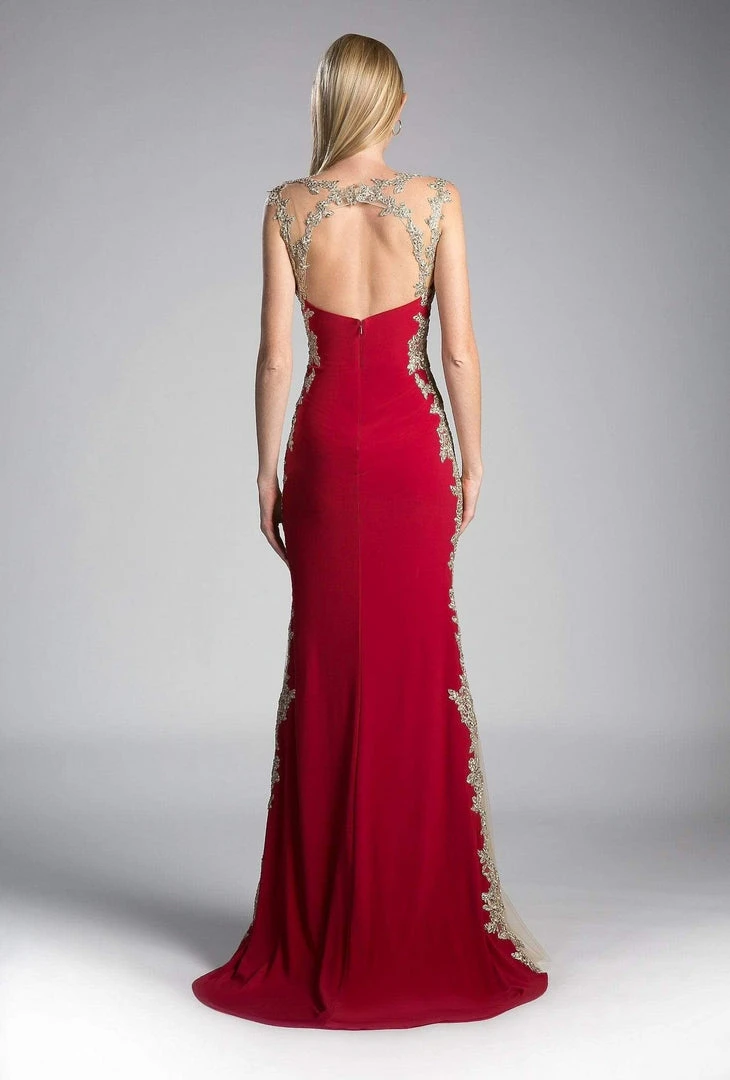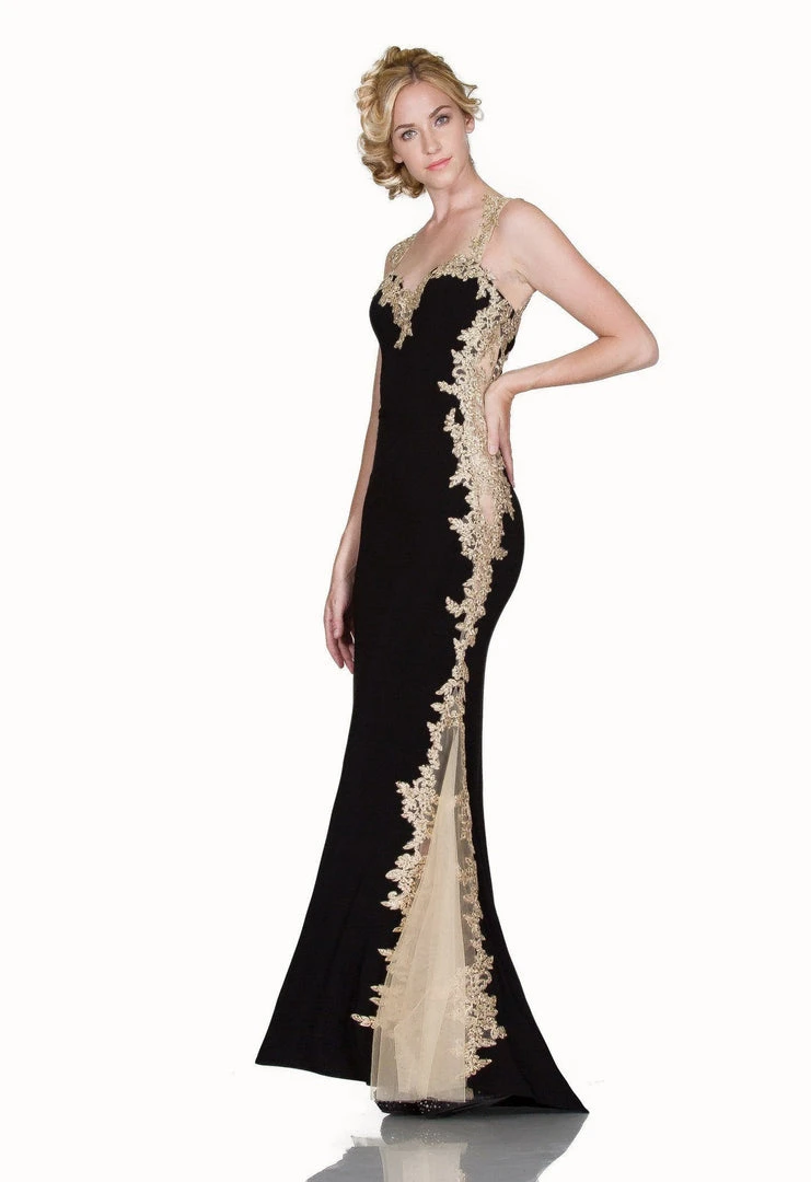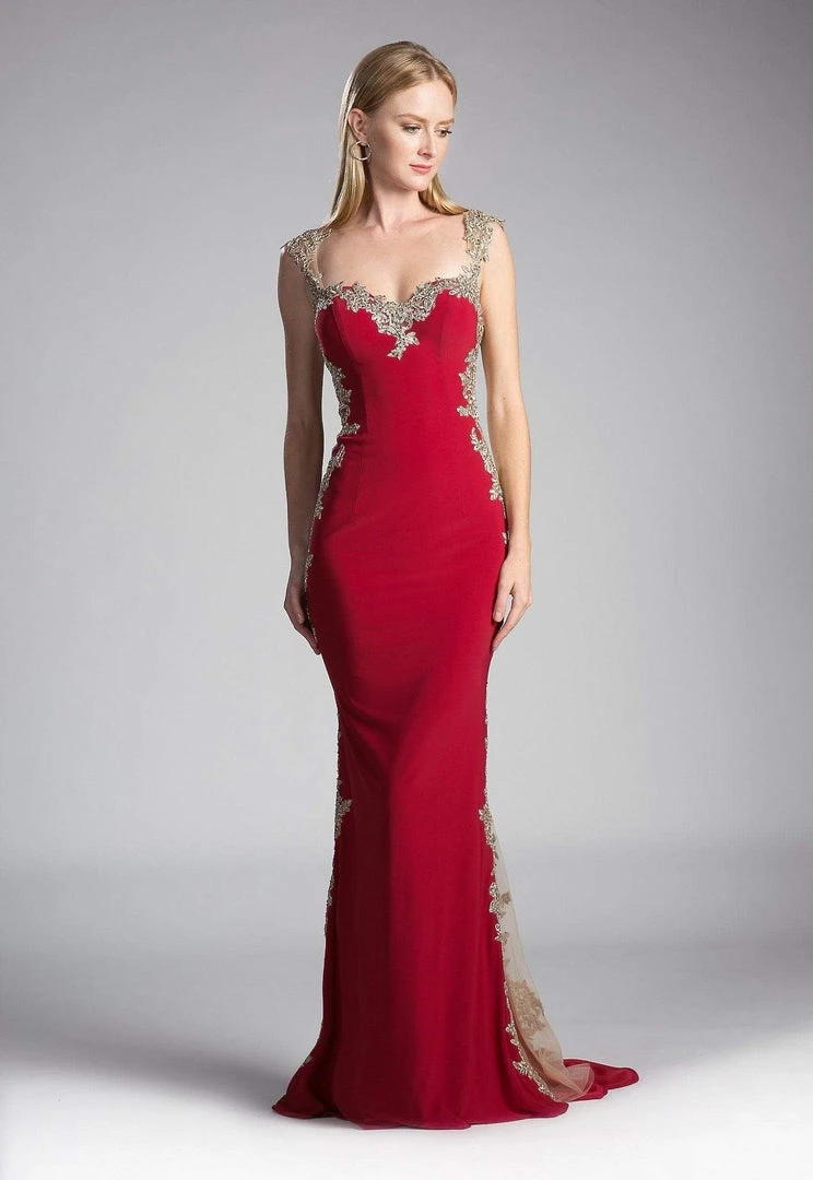 Orchestrate a spectacular evening of dazzling sophistication in this luxurious Cinderella Divine 8988 gown. This beautiful ensemble shows off with a sleeveless, sheer strapped, sweetheart neckline with bodice lavishly ornate with lace appliques. The back has a sexy cutout and zipper closure while the full length skirt finishes in a sweep train. Exhibit exceptional style in this superb evening gown by Cinderella Divine.