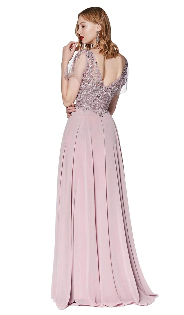 Get glamorous look with this dress by Cinderella Divine CD0135. Presents in a V-neckline with short flutter sleeves. The bodice is ornate with beautiful lace appliques and is styled with a V-back. The chiffon skirt opens in a flowy A-line silhouette and runs in full length hem. This Cinderella Divine dress is perfect for any formal evening.