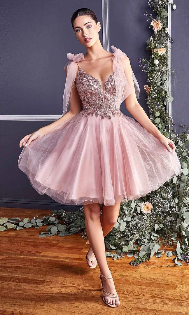 You are a breath of fresh air in this dreamy dress from Cinderella Divine CD0174. This cocktail dress features a sleeveless, deep V neckline with bow straps. The dress has an embellished bodice and a mid-thigh A-line skirt. Make it a moment to shine in this Cinderella Divine dress.