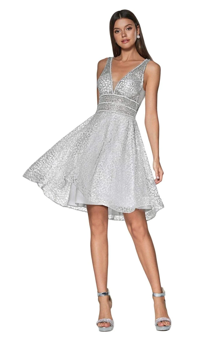 Shine through the night in this mesmerizing short cocktail dress from Cinderella Divine CJ256-S. This sleeveless A-line party dress brandishes in metallic glitter fabric, with V neckline and back, illusion cutout panels with sheer mesh insert, and rhinestone embellished triple band on the midriff. The dress waves and finishes at above the knee-length. This Cinderella Divine definitely flatters from every angle, a stunning look for your next party!