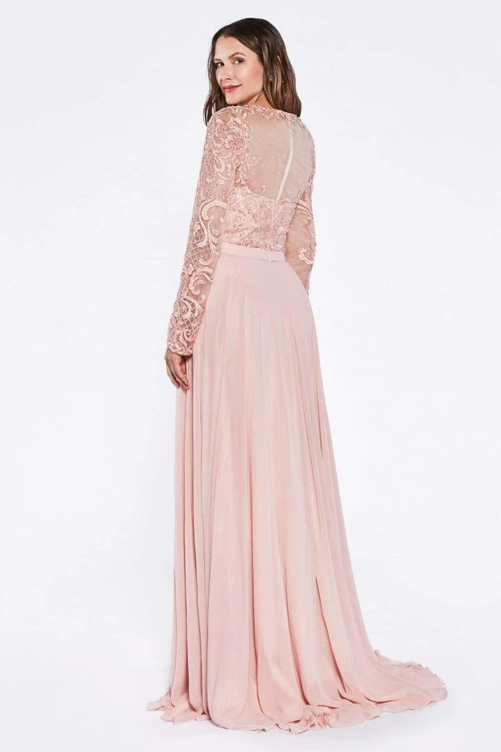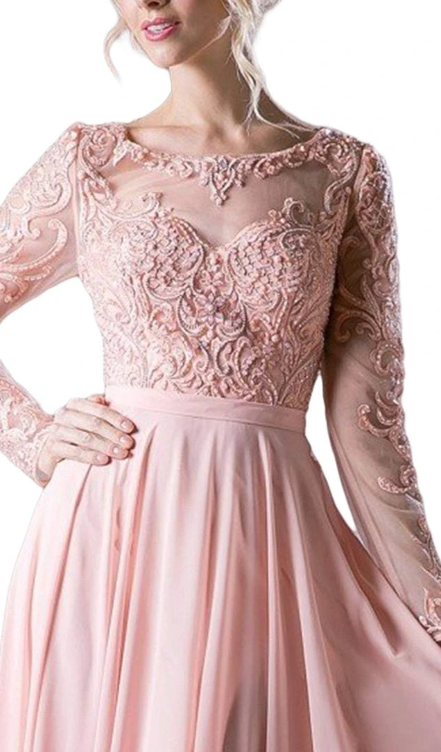 Shimmer and shine in an ethereal dress from Cinderella Divine CR780. Enchants in a long sleeve, bateau neckline with fitted bodice made of beaded embroidery. The waist is wrapped in a thin band and flourishes a full length chiffon A-line skirt. This Cinderella Divine dress is sure to create a striking look that is sure to make anyone remember your grand entrance.