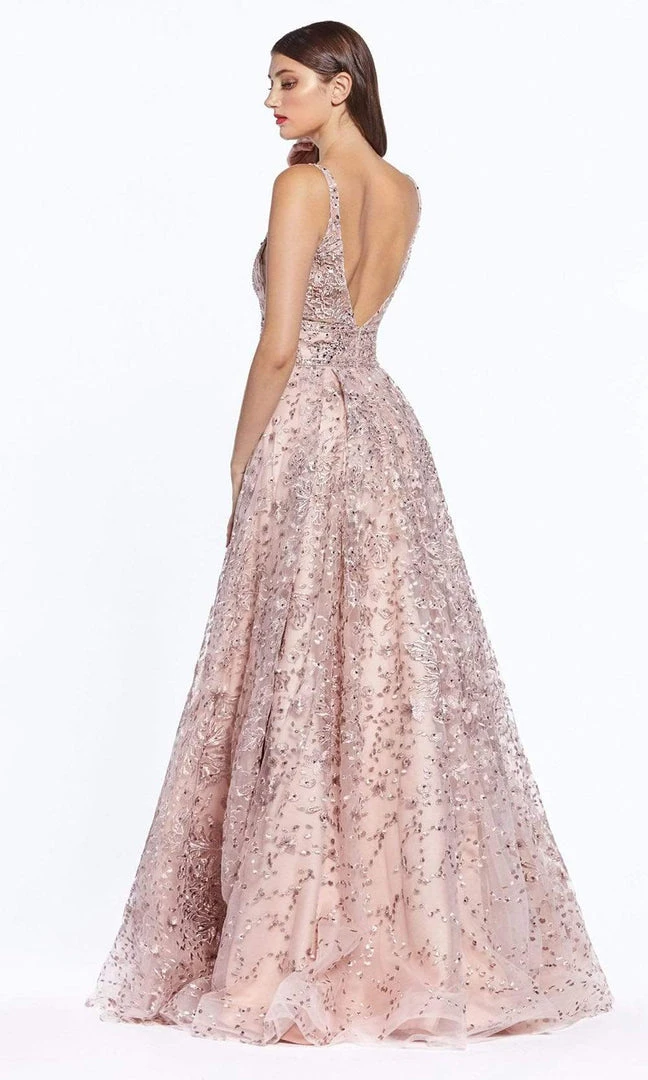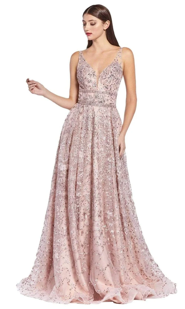 | Details: | Sleeveless, Plunging neckline, Sheer panel, Fitted bodice, Embroidery, Sequin appliques, Long A-line dress, Open V-back, Back zipper, Sweep train |