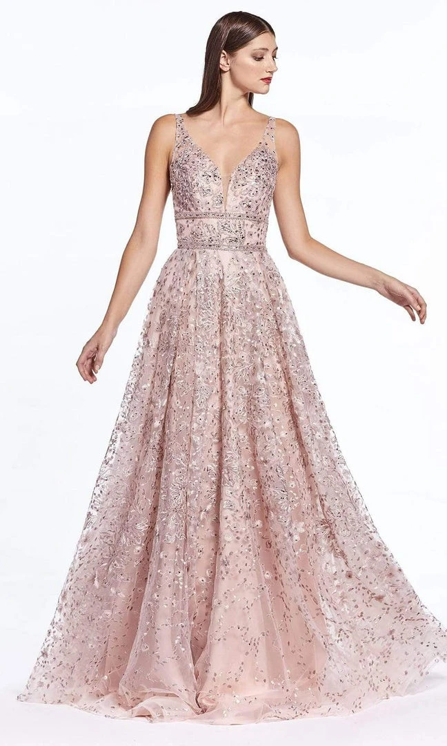 Wow everyone in this sophisticated dress by Cinderella Divine CR840. This floor-length dress is embellished with embroidery throughout and bead appliques. It features deep V-neckline and sheer paneling on a fitted bodice while it gives way to a floor-length A-line silhouette and comes with a sweep train. Cinderella Divine is sure to be both comfy and fashionable.