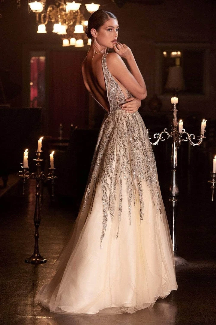 Beautifully ornamented with trailing sequin applique, this dress fashions a plunging V neckline with sheer inset detail at the bust and cut-out sides. The back shows a low V-shaped cut enclosed with a zipper closure. The A-line skirt cascades elegantly to the floor as it finishes with a sweep train. Model is wearing the Champagne color.