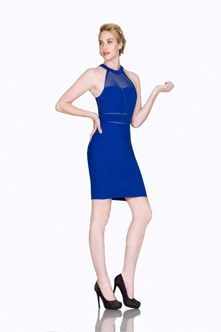 Captivate the crowd with this stunning Cinderella Divine CF088S cocktail dress. A halter neckline with sheer panel beautifully crowns this fitted stunner. Sheer cutouts along the bodice and waist offer a straight across lining and banded waist. The sheath silhouette elegantly cascades to a mid-thigh length as the sheer full back highlights a big keyhole detail adding sexiness to the whole ensemble. Finally, a center zipper closure secures the perfect fitting of this dress. Be ready to mesmerize the night with this Cinderella Divine masterpiece.