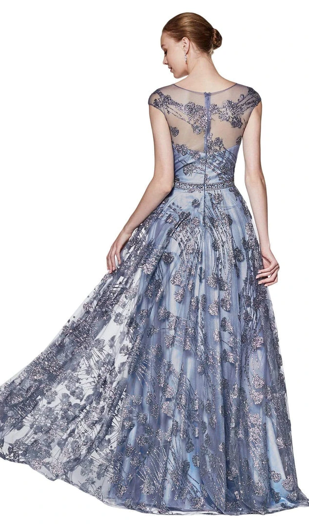 Elegantly designed in glitter floral pattern, this stunner boasts a fitted bodice framed with an illusion scoop neckline and cap sleeves over a distinct sweetheart lining. Fabulous pleats cascade the ballgown skirt as it flows to full length as the sheer full back is enclosed with a center zipper closure.