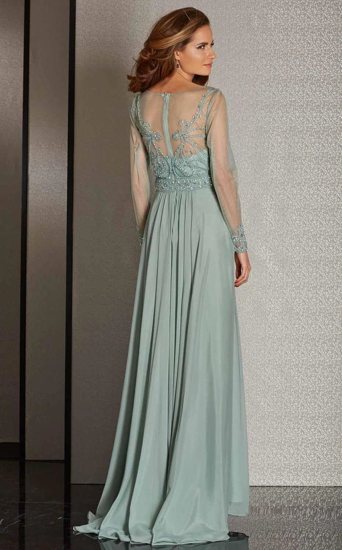 Extravagant and graceful, this fabulous evening dress from Clarisse M6215 will make you smile. The illusion bateau neckline bodice showcases long sheer sleeves and dazzling bejeweled cuffs for a sweet style. Twinkling with chic tonal embellishments, this ethereal creation drapes and flutters to the full-length hem in glamorous soft waves. Look good and feel good with this ostentatious dress from Clarisse.
