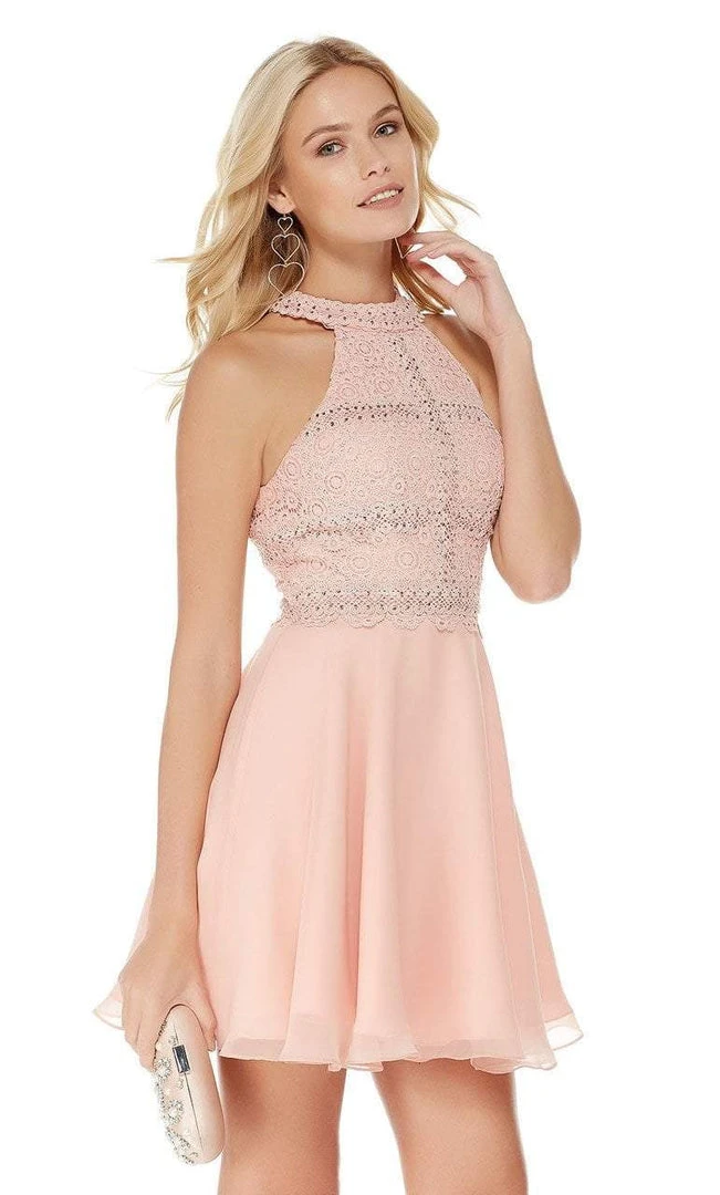Braided lace and beaded halter neck, short dress with keyhole cutout back and flowy chiffon skirt. Model is wearing the French Pink color.