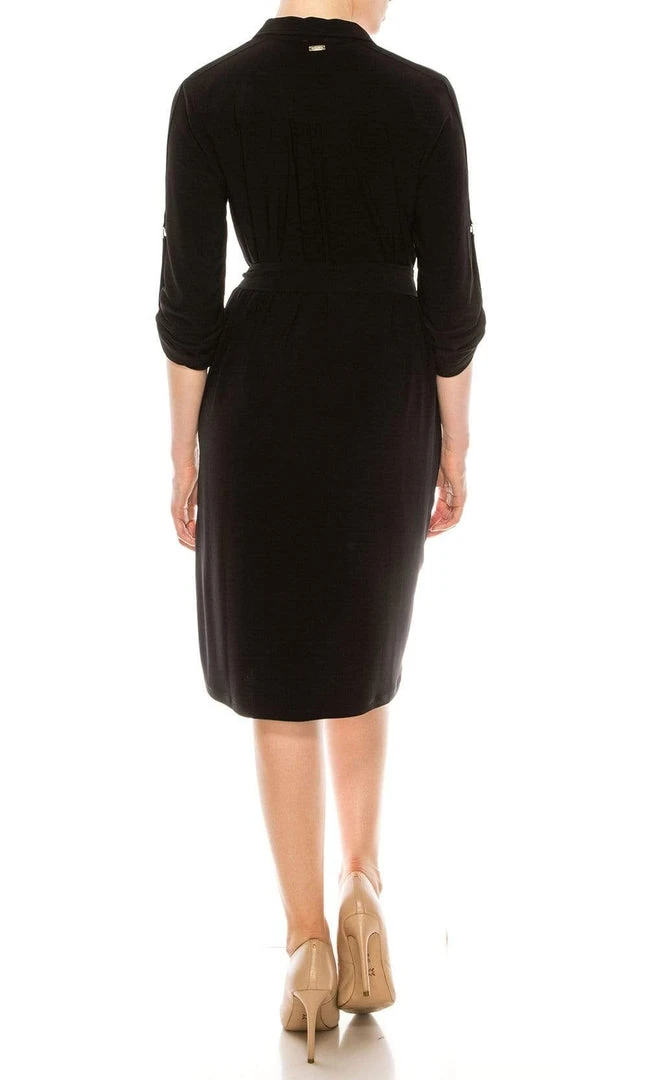 Dare to bare in this decadent dress by Anne Klein 10799116. This will show you off like a classic and sophisticated chic. It uses collared neckline and quarter sleeves that looks formal in a midi dress column-cut silhouette. It uses tie as band around natural waist. Anne Klein gives you an intricate look that will last a lifetime.