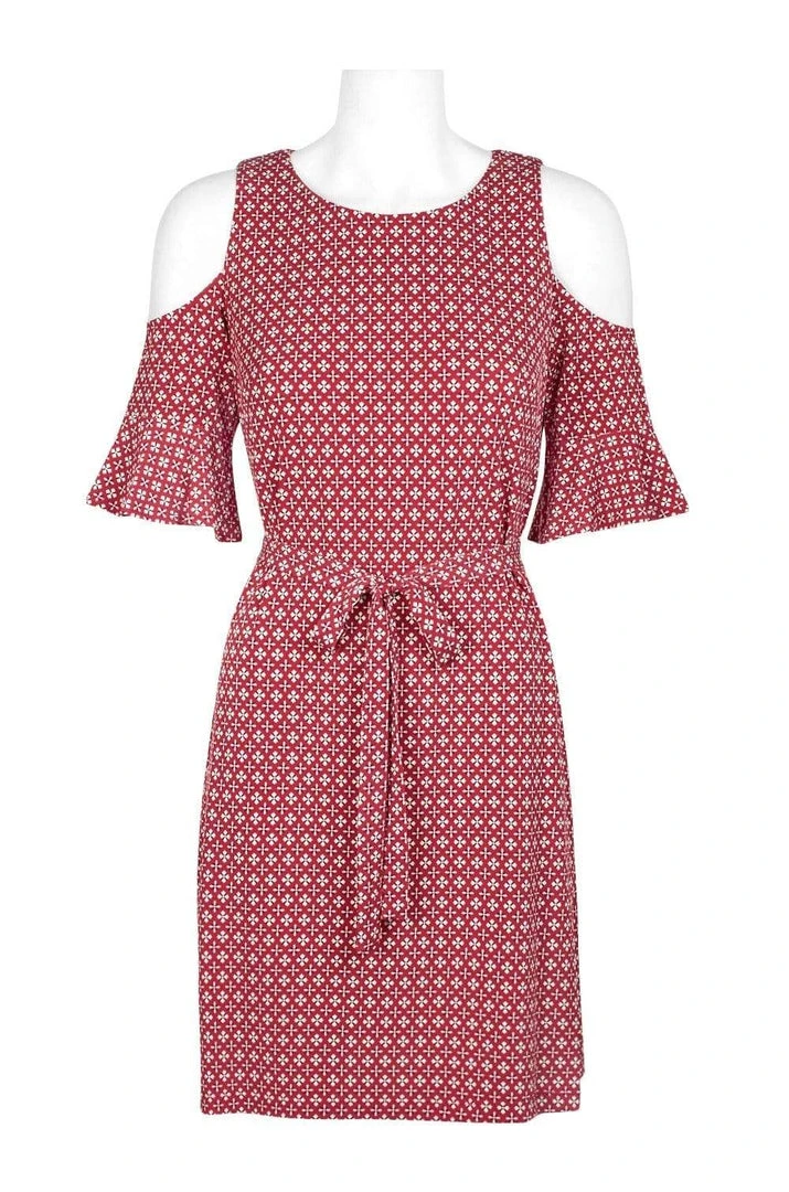 Turn heads instantly when you wear this dress by Donna Morgan D5260M. This multi printed jersey dress glams in a jewel neckline with cutout shoulders. The bodice has a tie waist and a mid-thigh A-line skirt. The back has a zipper closure. This Donna Morgan style is a charming choice for your next special occasion.