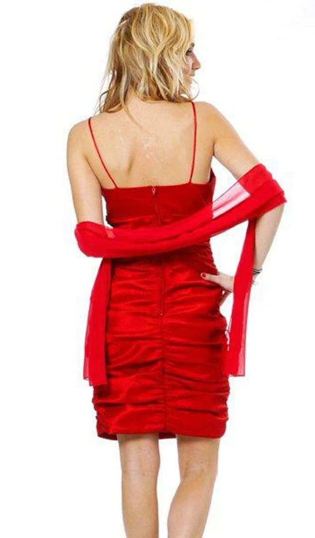 Flatter your spectacular figure while flaunting an exquisitely stylish look in this gorgeous dress by Eureka Fashions 1646. Mesmerizingly rendered with ruched details on vibrant Taffeta fabric, this lovely short piece boasts of an empire waist with rhinestone bead details coupled with delicate spaghetti straps and fine ruching on the bustier. The sheath skirt gushes down to complete with short hemline. Showcase your fine assets the refined way in this interestingly Eureka Fashions creation. Model is wearing the Red color