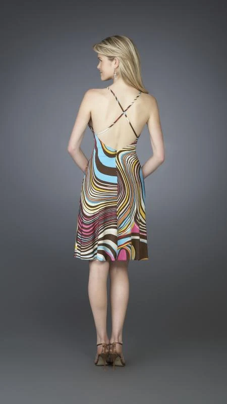 Turn heads instantly when you wear this La Femme 14027. This dress is in multicolor for class and attractiveness. The dress was created in v neckline and a criss cross back for added appeal. You are princess for an evening in this beautiful design. Be at your most elegant night in this La Femme creation!