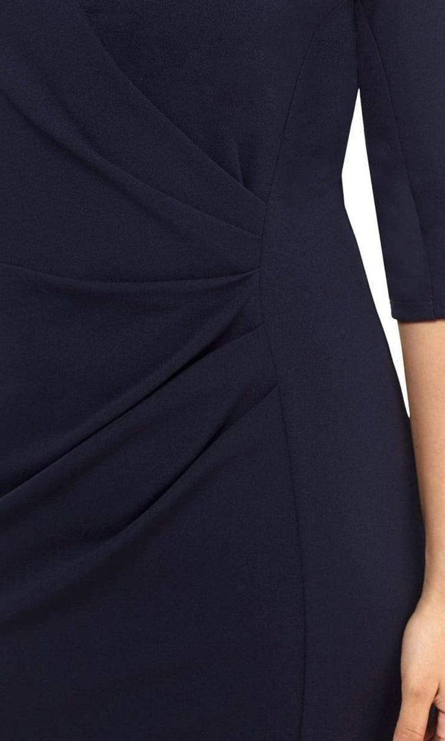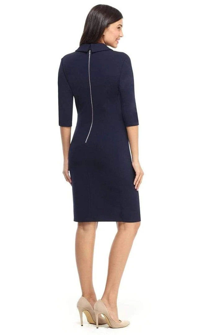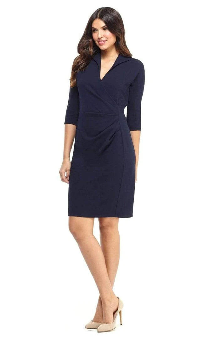 Be defined as a total stunner in this classy London Times T4703M creation. Accented with collars and defines a wrap style bodice, this quarter sleeve dress features a v-neckline with a zipper accented back. Designed with soft draping, the sheath skirt sculpts into a knee length hemline. Be revered as an alluring vision in this London Times masterpiece.