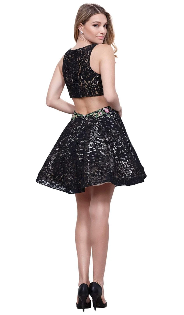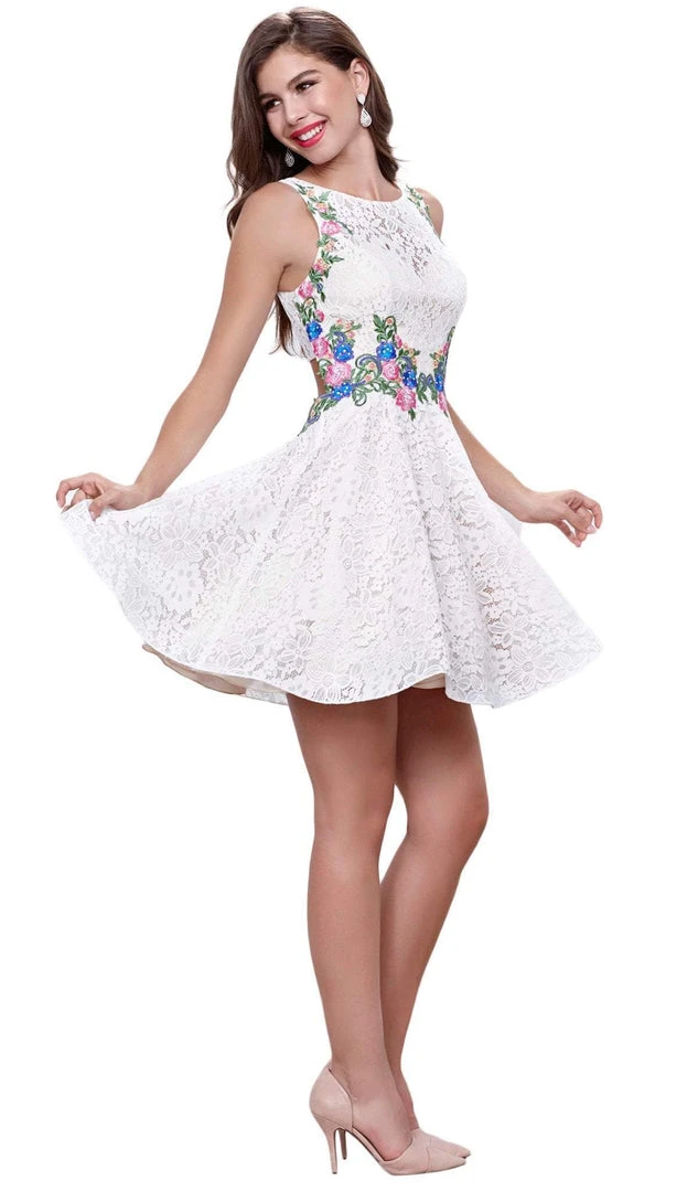 Make a lasting impression as you flourish flair in this Nox Anabel 6281 creation. This cocktail dress parades in a sleeveless bateau neckline with bra cups underneath the lace and floral embroidered dress. The waist is adorned by multicolored floral embroidery and the skirt gives off a short A-line silhouette. Walk into a room like a breath of fresh air in this Nox Anabel masterpiece.