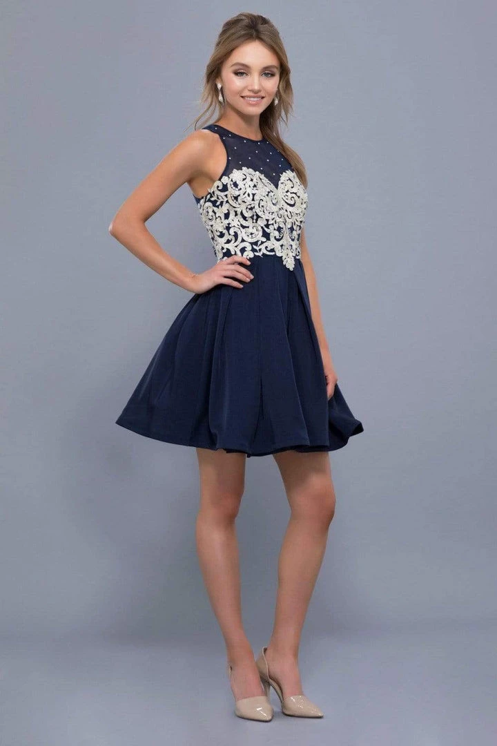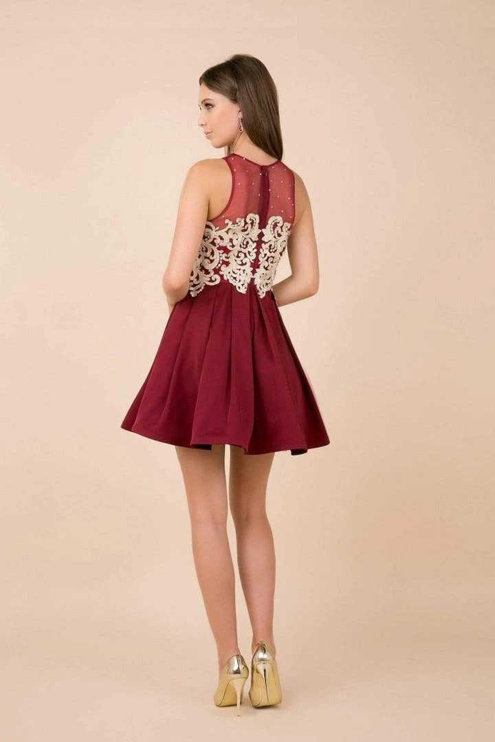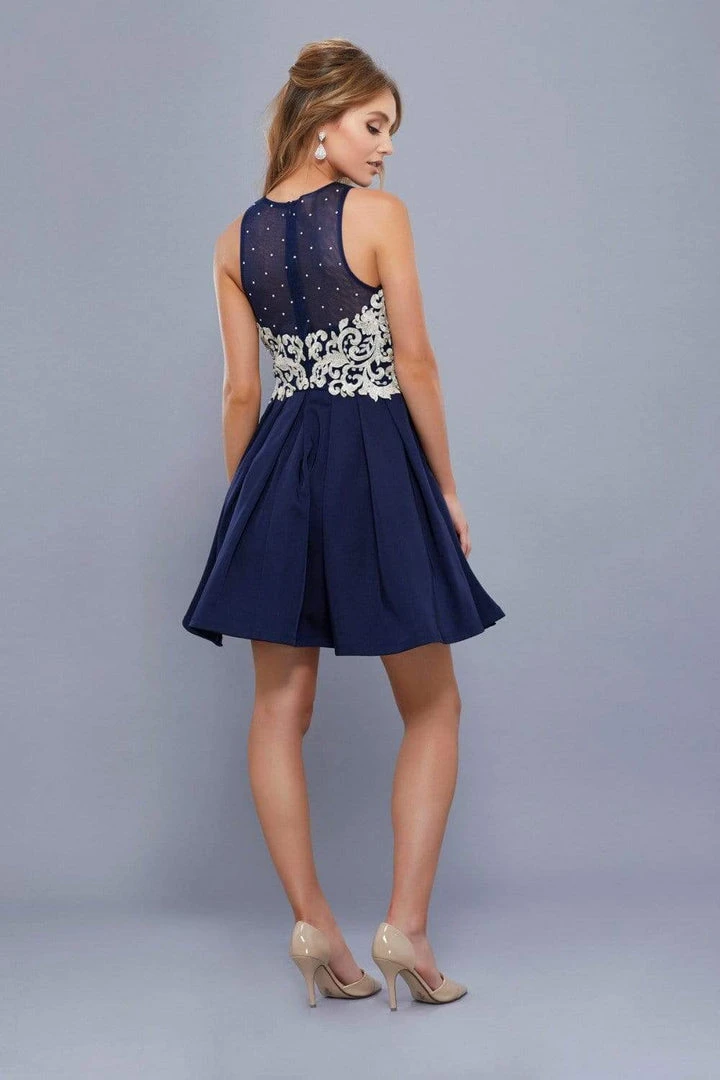 Lavish in the flattering chic style of this Nox Anabel 6338 creation. Embellished with metallic lace appliques while being sprinkled with rhinestones, this piece flaunts an illusion jewel neckline and a sheer back. The A-line skirt flows in lovely pleats as it falls into a short hemline. Sparkle with exquisite elegance in this Nox Anabel masterpiece. Models are wearing the Burgundy and Navy colors.