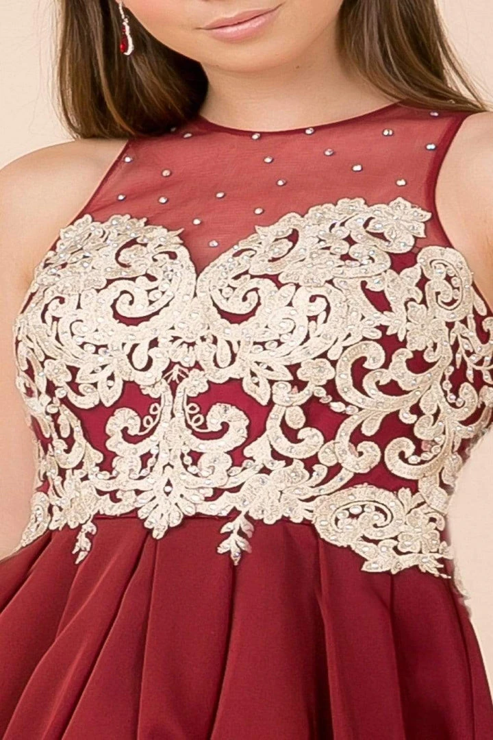 | Details: | Metallic Lace Appliques, Rhinestones, Sheer Full Back, Back Zipper Closure, Pleated Skirt, Short Hem |