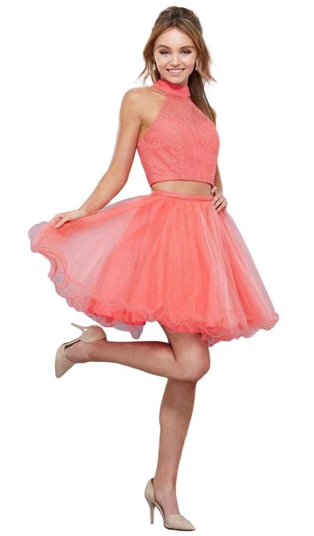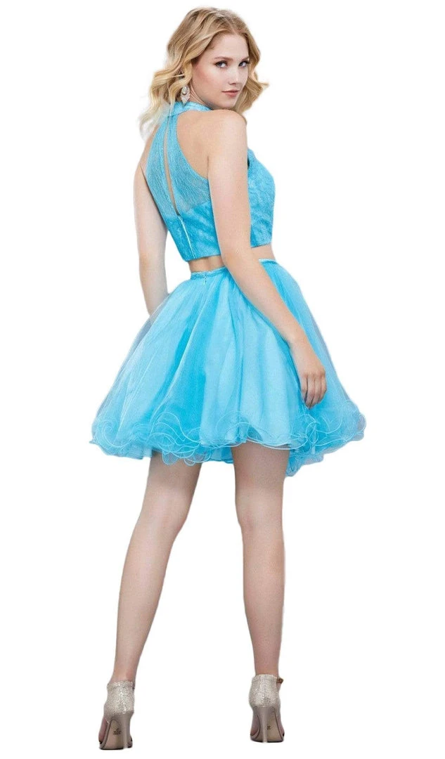 Shine through the night in this mesmerizing dress by Nox Anabel 6354. This two piece short dress features an illusion high halter neckline with a sleeveless design. The crop-top bodice is adorned with beautiful lace appliques and a sheer lace keyhole open back. This dress also features a short ruffled tulle skirt with a zipper closure at the back. This Nox Anabel creation is simply captivating!