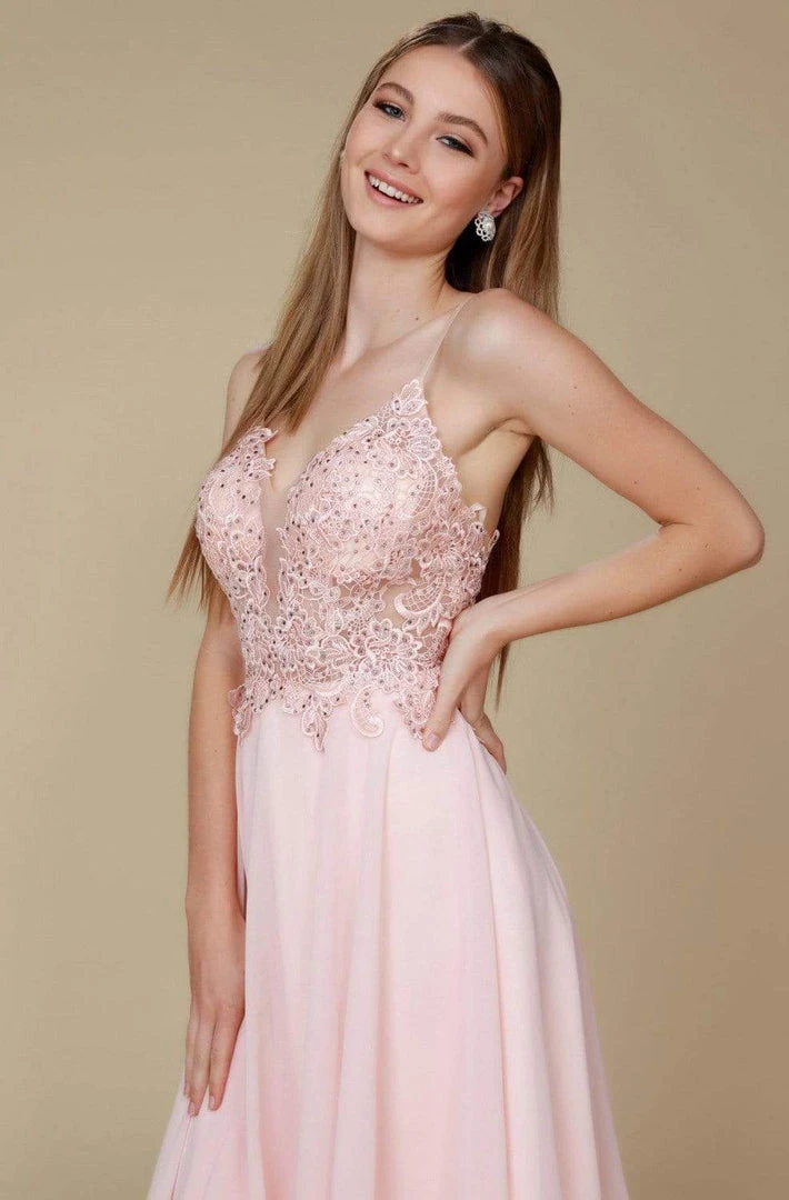 Sparkle in beauty wearing this dress by Nox Anabel A660.Appeals in a sleeveless, V-neckline with fitted bodice designed with beaded lace. Spaghetti straps support the bodice and from the waist features a flowy A-line skirt. Be a vamp in an alluring dress from Nox Anabel.
