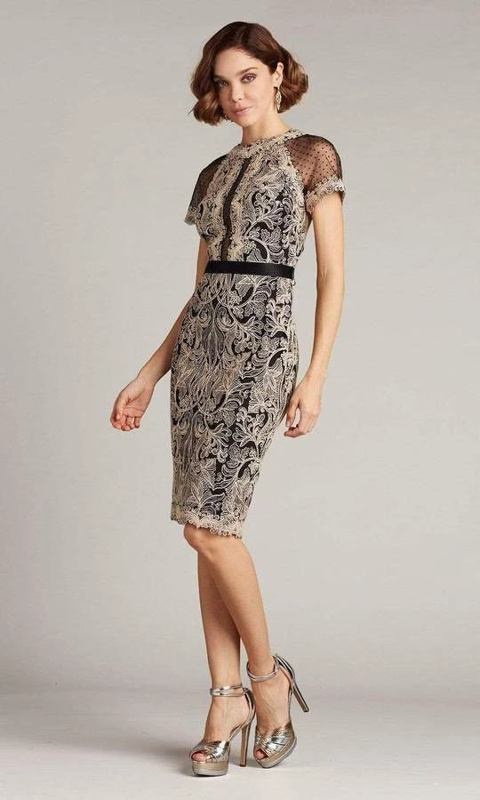 Tailored with d’spirit raglan sleeves and an illusion cutout on the bodice, this dress charms with a high neckline and a full back. Lace appliques match the gilded style of this piece. Nipped with a satin waistband on its sculpted lace silhouette, the skirt trails into a knee length hemline.