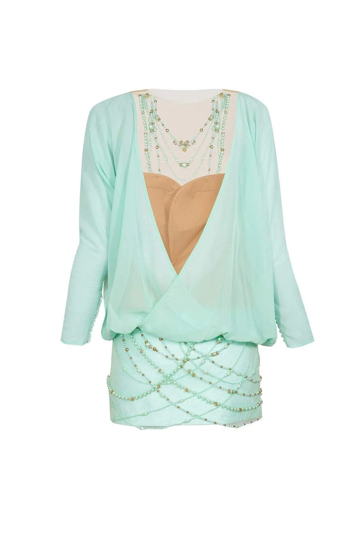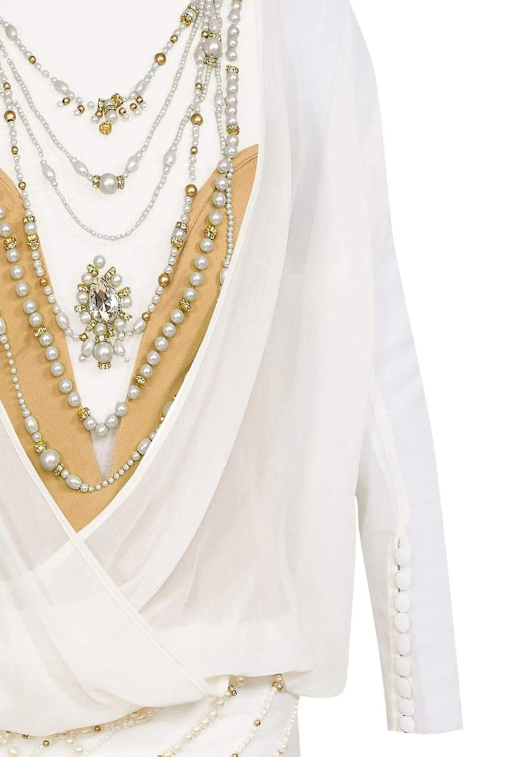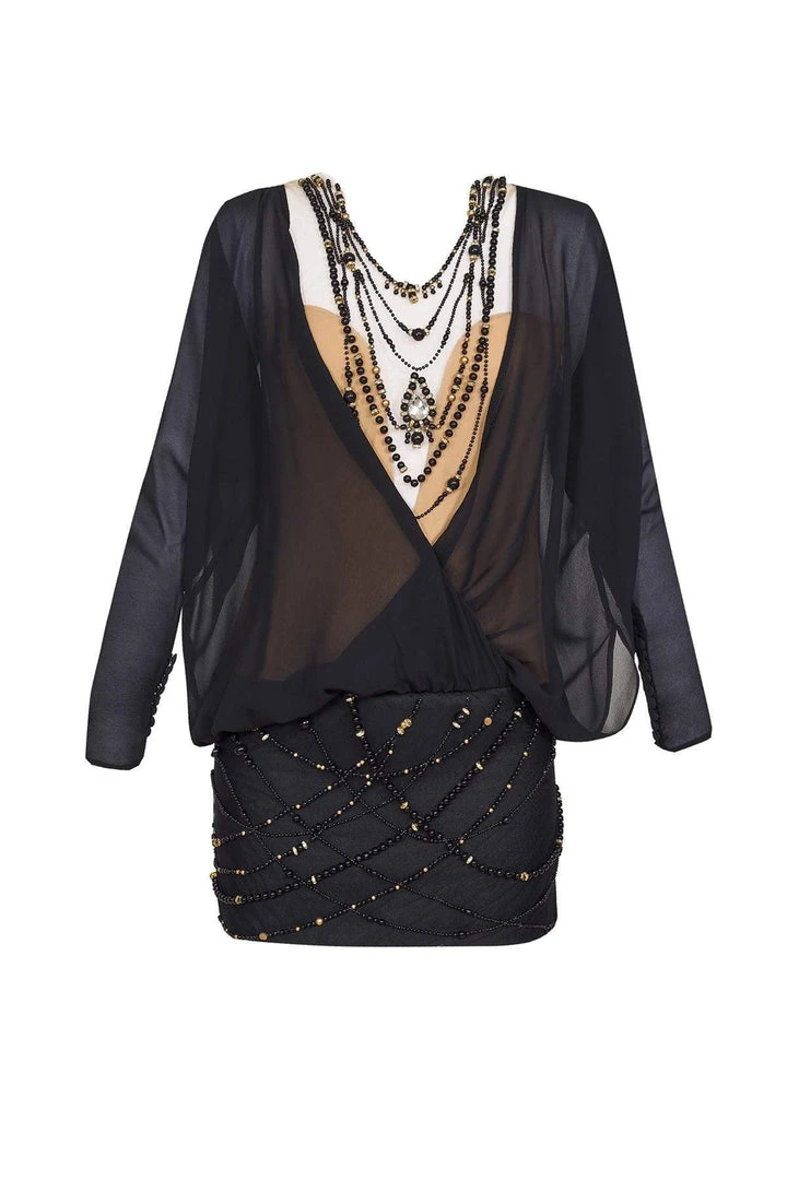 | Details: | Long sleeves, Sheer fabric, Bead embellishments, V-shaped back, Short beaded skirt |