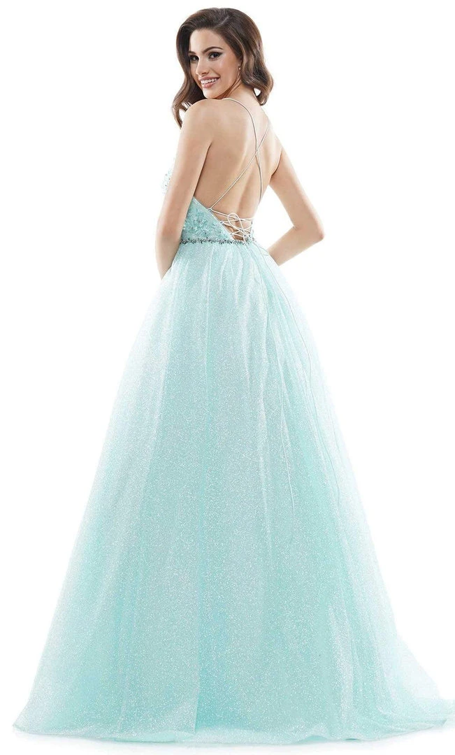 Get ready to be captured in picture of sophistication in this Colors Dress 2480 masterpiece. The fitted bodice showcases a plunging V neckline, supported with spaghetti straps which criss cross the open back. Designed with glitter accents, the ballgown skirt cascades to a full length hemline, completed with a sweep train. This Colors Dress ensemble is designed with glamour in mind, perfect for your upcoming social event.