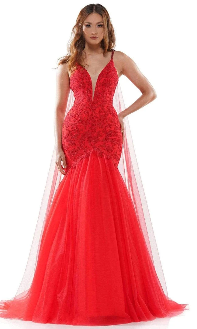 Glide into that spectacular black-tie event like an ethereal vision as you flaunt this gorgeous creation from Colors Dress G962. Adorned with beads and lace appliqued, this stunning gown showcases a sleeveless and plunging V neckline while the open back shows off a V-shaped cut, followed by a center zipper closure. The gown glistens with its beaded straps while a dramatic long cape flows from each side of the shoulder. The skirt flourishes in a full-length mermaid silhouette and ends with a sweep train for added drama. Stand out among the fabulous crowd as all eyes focus on you in this glamorous Colors Dress masterpiece.