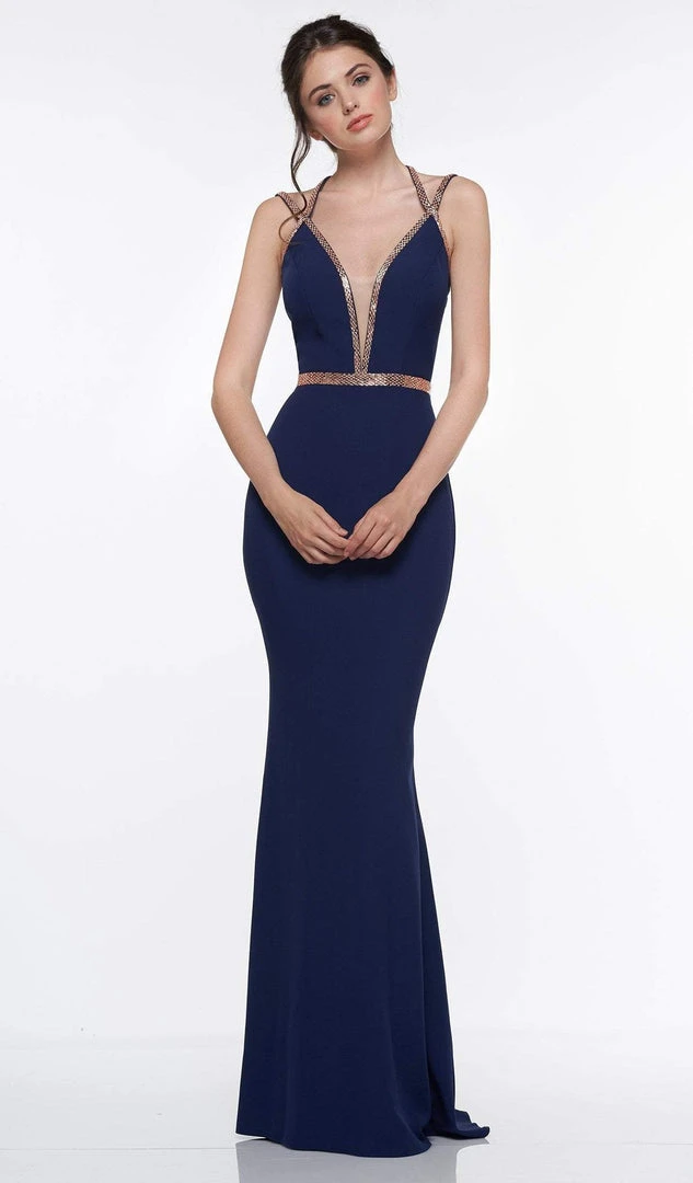 Sculpted in a rich matte jersey fabric, this gown shows a plunging v-neckline framed with an illusion modest inset, metallic beaded trims and double shoulder straps. Embraced with a metallic beaded band around the waist and designed with a bandeau strapped back, the trumpet skirt skims along the hips and flares glamorously into a train.