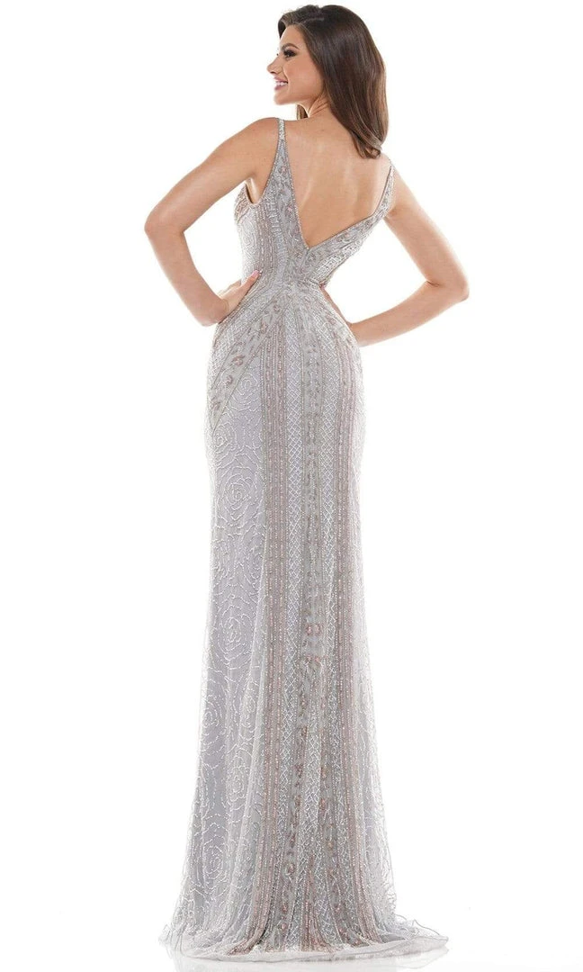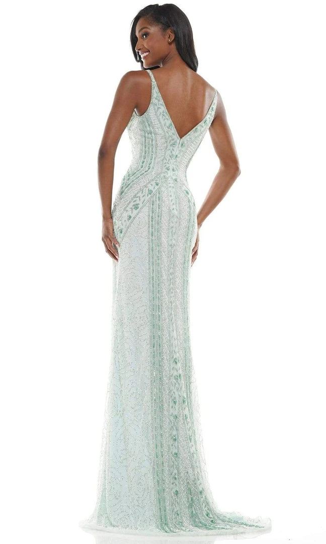 Be the embodiment of pure feminine flair in this mesmerizingly ornate Colors Dress K108 creation. Stunningly embellished with beadings all throughout its sheath silhouette, this curve-hugging bodice features a sleeveless, plunging V neckline with a sheer inset at the bust. The back flaunts a V shape cut and has a zipper closure while the full-length skirt finishes in a sweep train for added drama. This Colors Dress style is sure to make you the darling of the party!