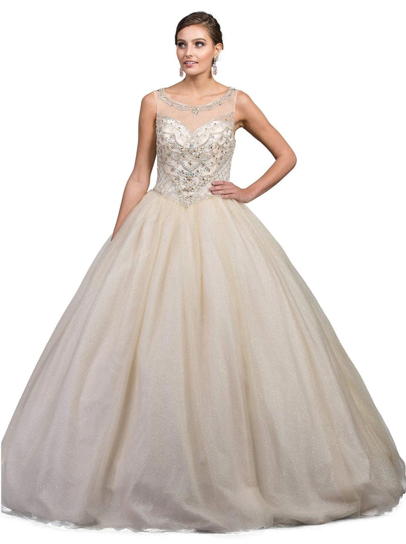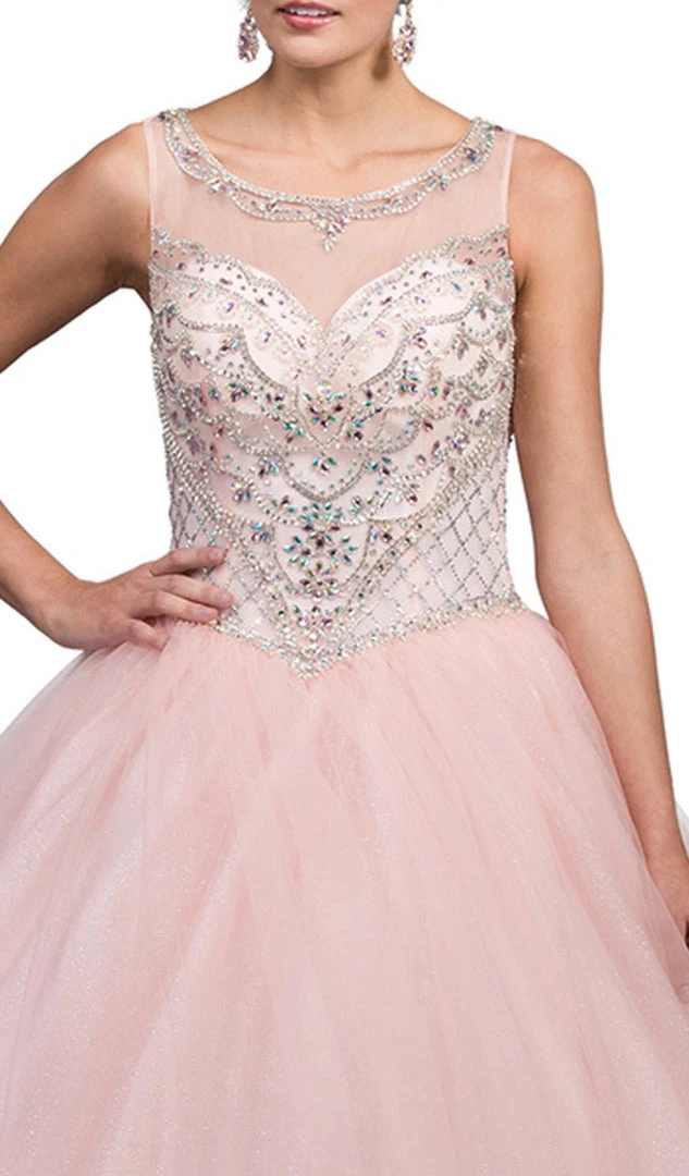 Take their breath away with this stunning gown. Showcases a sleeveless, illusion bateau neckline with sweetheart lined bodice ornate with glittering accents. The back has a cutout, lace up closure and a back zipper. From the basque waist begins a full length ballgown skirt. Look great for your special event in this beautiful masterpiece.