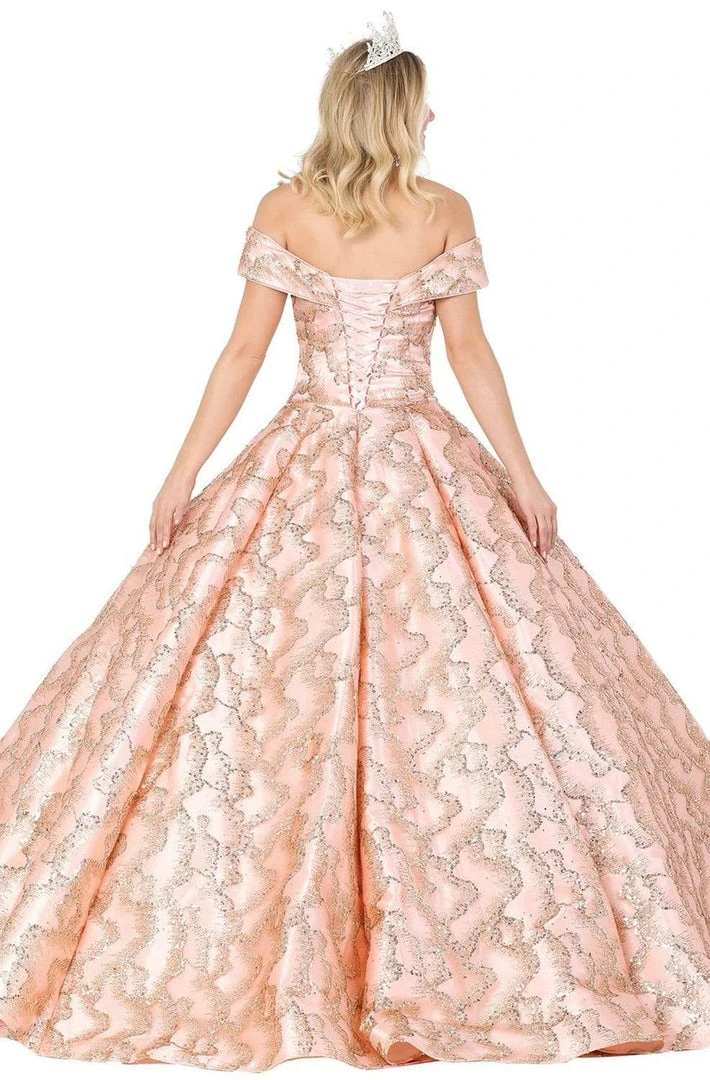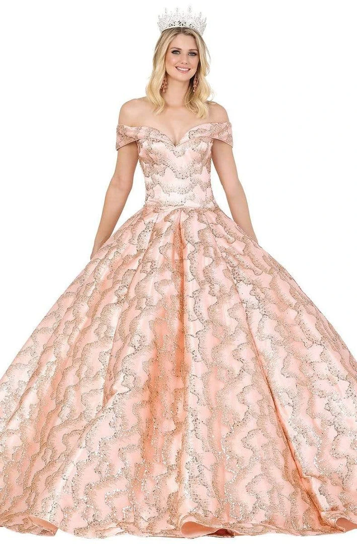 Surround yourself with decadence in a dazzling couture from Dancing Queen 1450. A folded off-shoulder neckline crowns the fitted bodice, complemented with mid-open lace up back as stunning pleats adorn the ballgown skirt which falls to a full length hemline. The whole dress is designed in glitter embellishments which offer the sparkling effect. Beam with pride as you show up in this Dancing Queen creation. Find more quinceanera dresses!