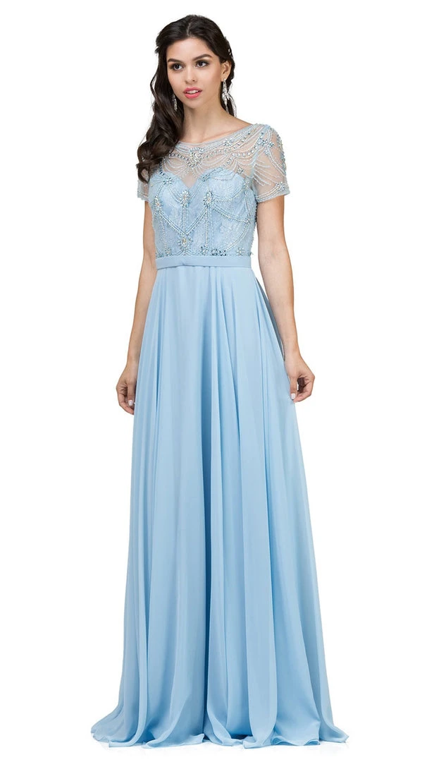 Get ready to be captured in picture of sophistication in this evening gown. This long dress features an illusion scoop neckline and short sleeves. A sweetheart lining is prominent at the bodice. Sparkling embellishments are stunningly fashioned at the bodice while the banded waist leads to the pleated A-Line skirt that flows to the floor. The back has center zipper closure. Get that glamorous casual feel in this beautiful creation.