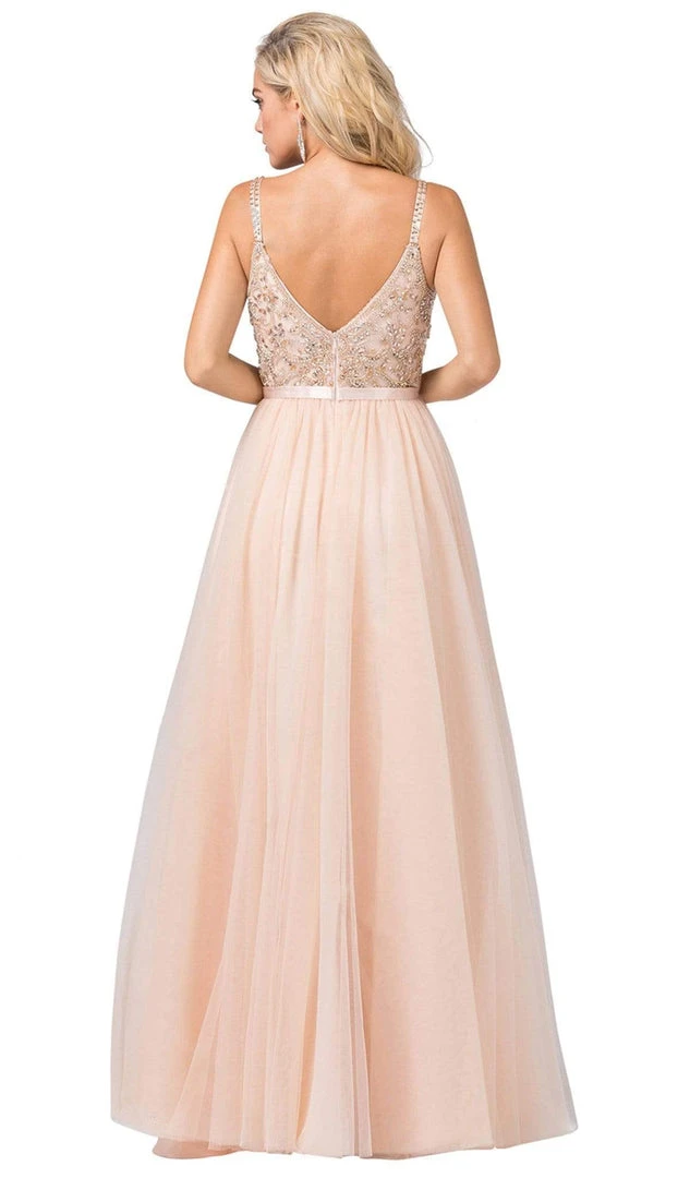 Bask under the spotlight when donning this gorgeous Dancing Queen 2519 creation. Glistening with beads along its embroider-ornate bodice, this darling shows a v-neckline stringing from double beaded straps. Crafted with a deep v-open back and embraced with a satin band, the tulle skirt cascades beautifully into a full-length hemline. Make waves and dazzle in this Dancing Queen masterpiece.