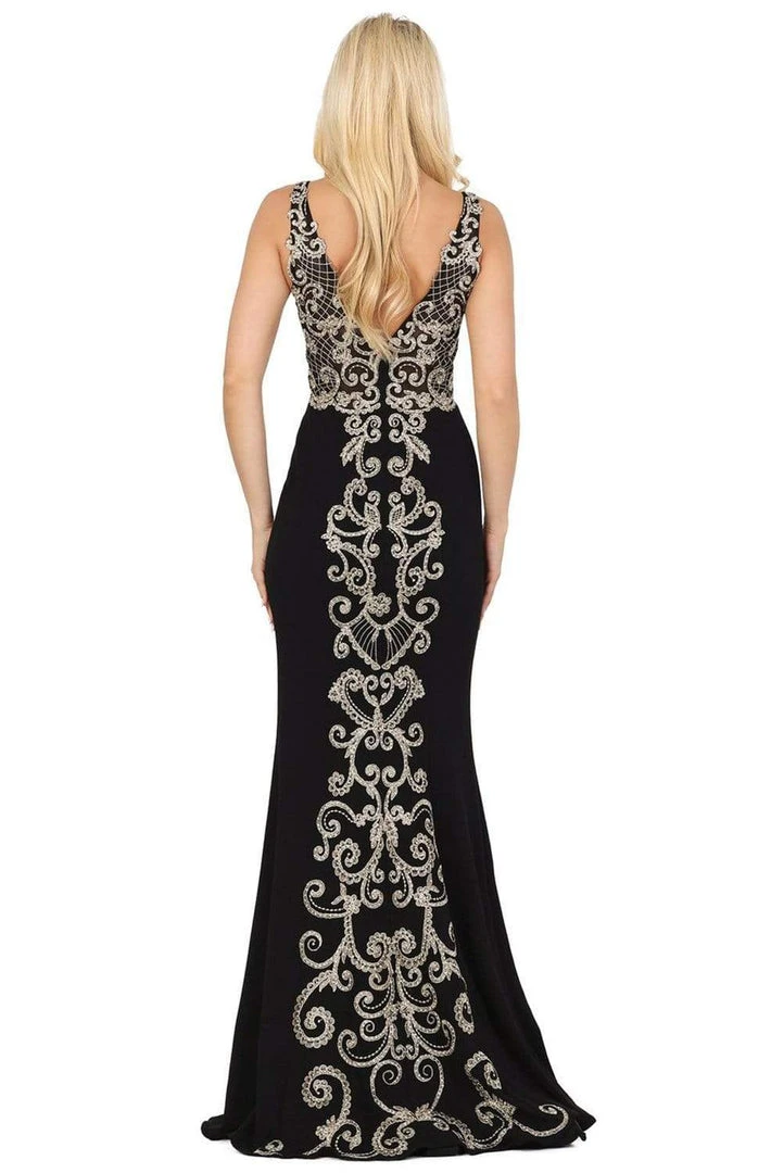 Flaunt your inner goddess in this divine look from Dancing Queen 2912 Prom Dress. Fashions a sleeveless V-neckline, semi sheer bodice ornate with Lace appliques in regal pattern. The back brandishes a V shape with center zipper closure and features similar lace appliques running through its full-length skirt. The dress flatters your figure with its fit and flare silhouette. Turn yourself into a timeless beauty in this creation by Dancing Queen.