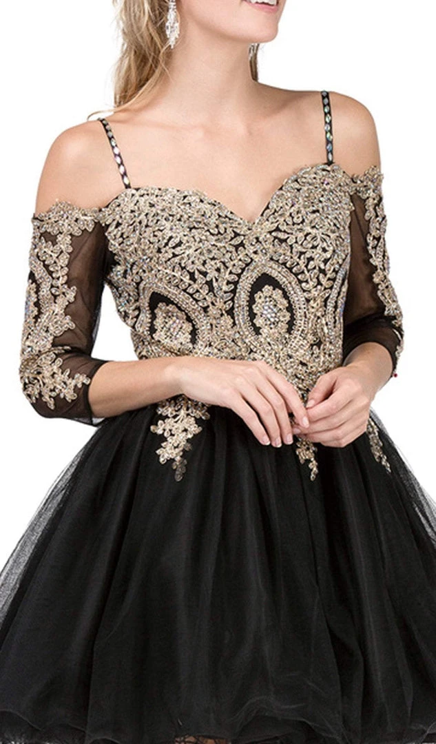 Get glammed as you wrap up in this winning style by Dancing Queen 3001. This stunning cocktail dress is beautifully crafted with a charming sweetheart neckline and trendy cold shoulder style, sheer quarter length and beaded shoulder strap. Gold lace applique with sparkling beads elegantly adorns the bodice, with a corset style lace up back ensuring a body-hugging fit. Soft gathers of tulle overlay emerge from the natural waistline as it flares and finishes at mid-thigh. Win the night over wearing this bouncy and pretty Dancing Queen cocktail dress.