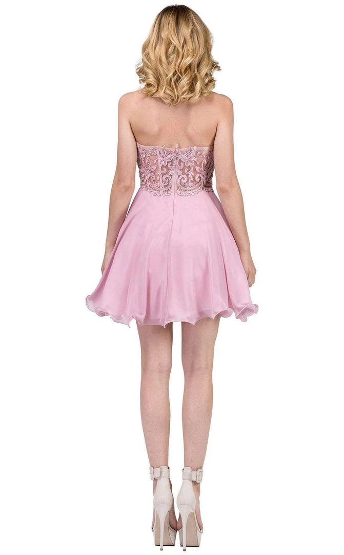 Sparkle with elegance and feminine style when you walk into the room wearing this exquisite Dancing Queen 3005 creation. Detailed with rhinestones atop stunning lace appliques, this fancy piece shows a strapless sweetheart neckline paired with an illusion mid-open back. Beautifully scalloped around the natural waist, the A-line skirt flares amazingly into a short rolled hemline. Be at your most exceptional poise as you claim everyone’s attention in this Dancing Queen masterpiece. Models are wearing the Burgundy and Dusty Pink colors.