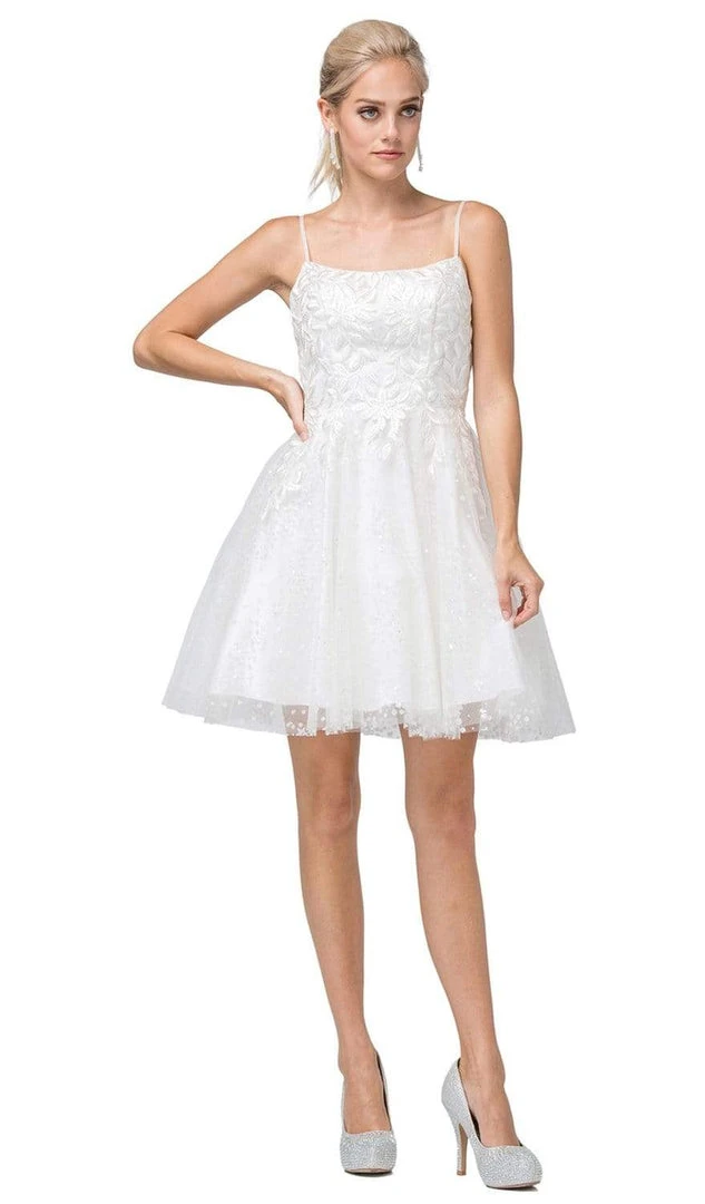 Steal the spotlight while showing off this Dancing Queen 3158 creation. Fascinatingly embellished with a spectacle of embroidered foliage on its bodice, this piece shows a subtle scoop neckline with spaghetti straps. Showcasing a deep and sheer v-open back, the A-line skirt flares into a short hemline. Glam up with poise and beauty in this Dancing Queen masterpiece.