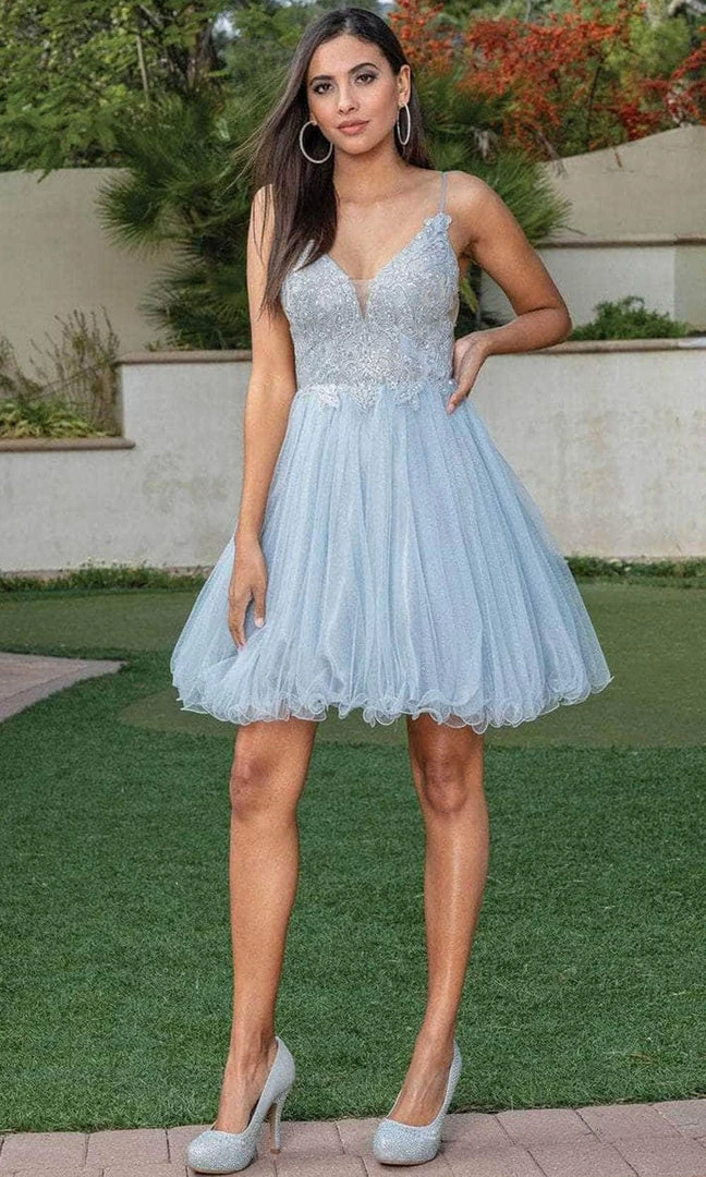 Be the loveliest of them all wearing this cocktail dress by Dancing Queen 3314. Glamorously decorated with lace embroidery and beadworks on the sleeveless bodice, this stunner features a plunging V-neckline and spaghetti straps that lead to a mid-open V-back. The dress also comes with a sheer inset detail at the bust and sides of the fitted bodice. While the gathered skirt reveals a layer of tulle and it finishes in a curled short hemline. Unleash an inner glamour that attracts all eyes on you in this Dancing Queen masterpiece. Models are wearing the Bahama Blue, Champagne, Lilac, Rose Gold and Silver colors.