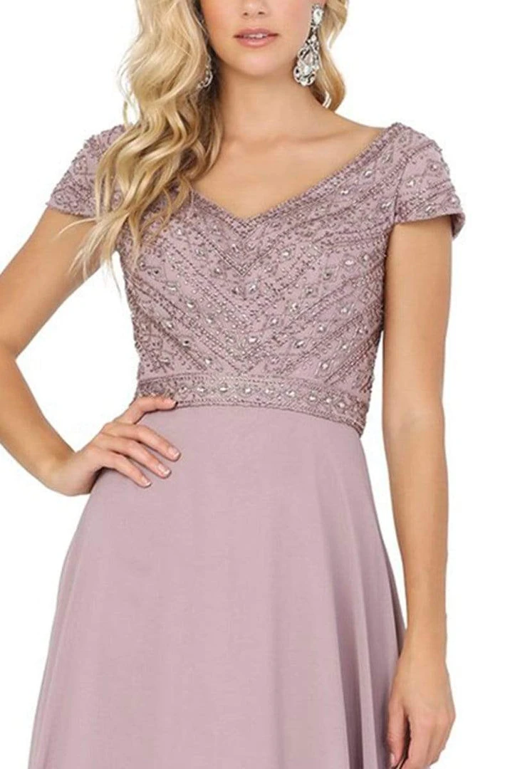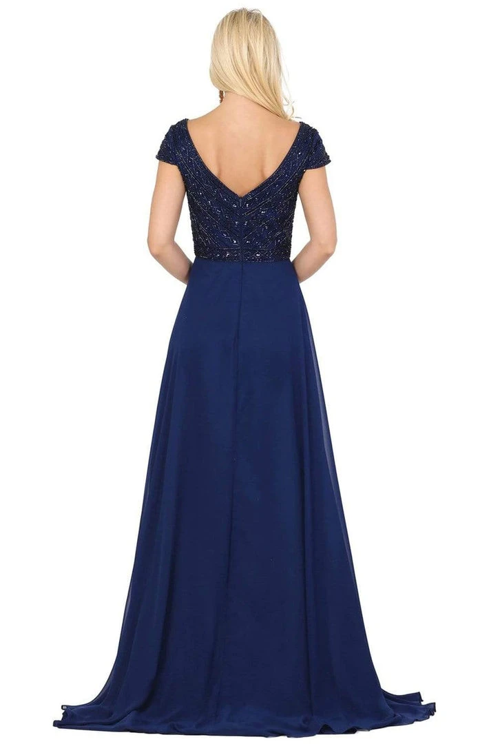 Be adored by the stylish crowd when you arrive in this timeless Dancing Queen 4015 creation. Textured with beadwork on a fitted bodice, this gown flaunts a portrait v-neckline with short sleeves. Designed with a deep v-open back, the chiffon skirt cascades to create a slender A-line silhouette and train. Capture the glamorous feel in this Dancing Queen masterpiece.
