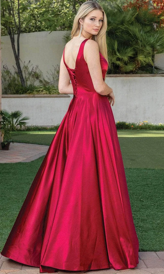 Be dazzled with the sleek beauty of this Dancing Queen 4262 creation. Ornamented with wide pleats that crafts into a faux wrap bodice, this piece reveals a v-neckline with tapering shoulder straps. Intricately cinched with a corset styled back, the gleaming skirt cascades to touch the floor with a sweeping denouement. Embrace the fascinating style of this gorgeously sleek Dancing Queen masterpiece. Models are wearing the Burgundy, Copper, Dusty Blue, Hunter Green, Navy, Plum and Royal Blue colors.