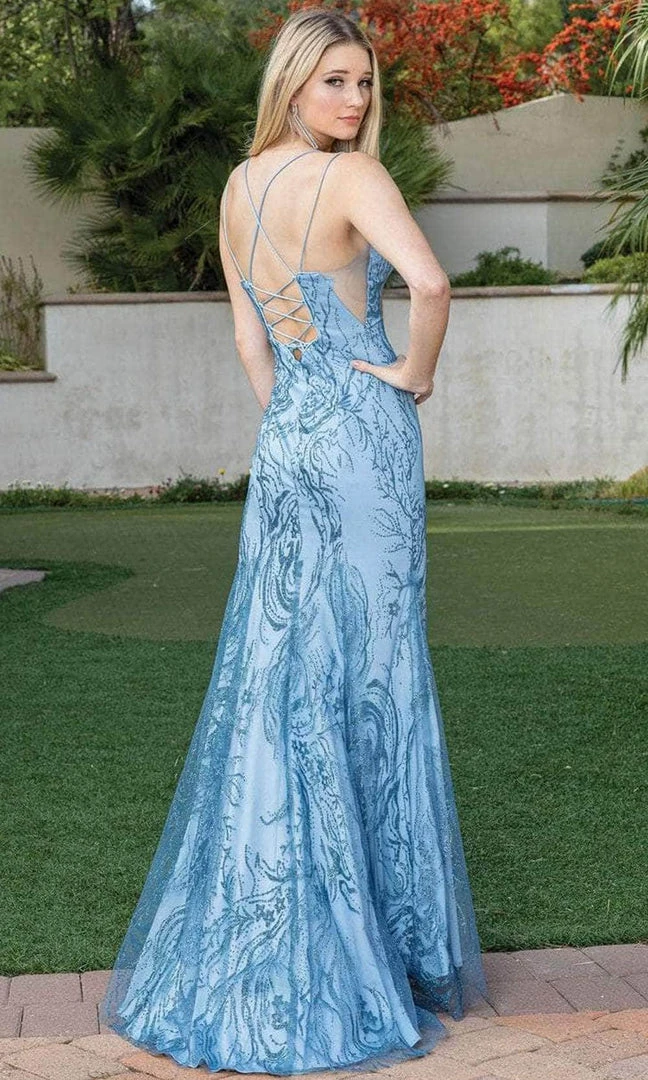 Radiate magnificent elegance in this stunning long dress by Dancing Queen 4302. Embroidered with intricate sparkling embellishments all throughout, this sleeveless beauty unveils a low-cut V-neckline held by thin straps. The dress is styled in a crisscross strappy back and is secured with a zipper closure. The sheath skirt streams down to a perfect full-length hemline and paired with a high slit. Reveal that inner goddess in you in this dancing Queen masterpiece! Model is wearing dusty Blue color.