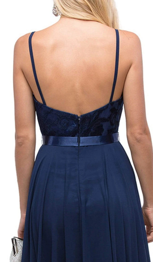 Make yourself into a vision of loveliness in this spectacular gown. The sleeveless bodice boasts a scoop neckline and spaghetti straps that leads to a glamorous open back. The embroidered bodice is matched with a satin belt that cascades to the chiffon skirt. This A-Line ensemble flows with beautiful pleats to a full length hem. The open back is enclosed with a center zipper closure. This design is undeniably another great creation! Model is wearing Blue color.
