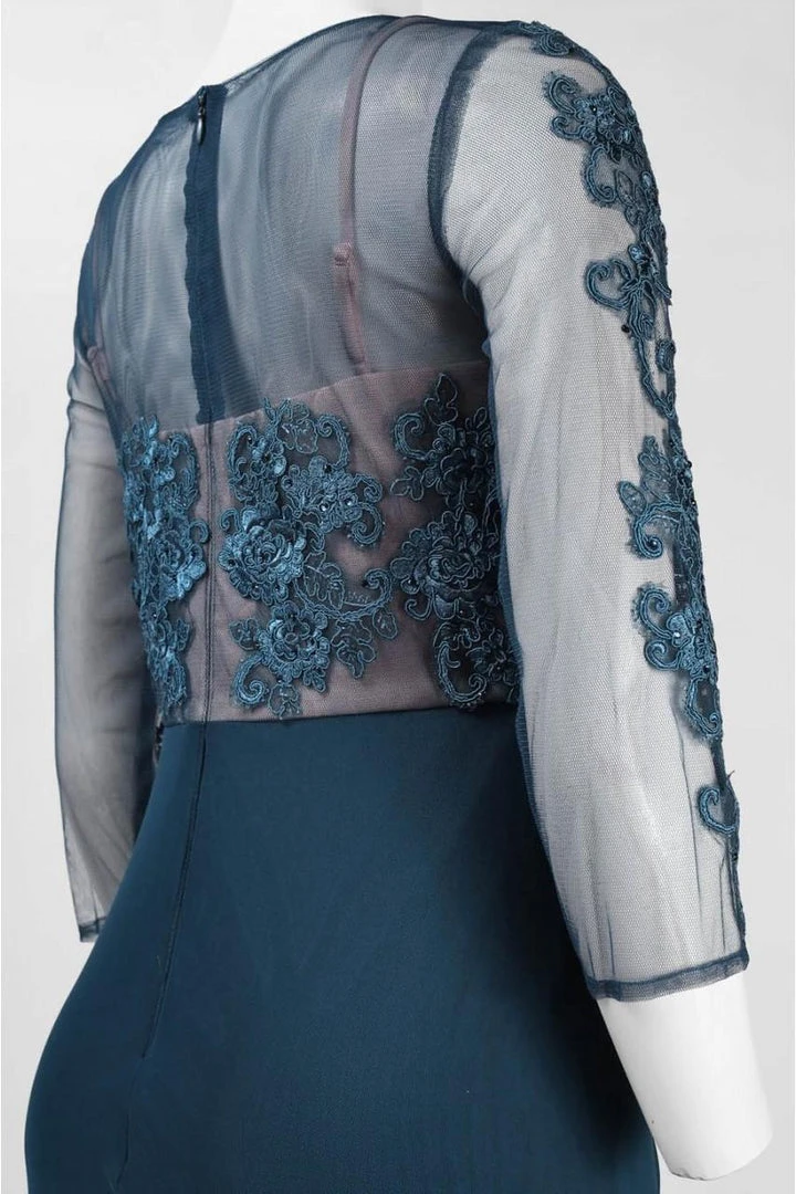 | Details: | Sheer Quarter Sleeves, Lace Appliques, Draped Skirt, Sheer Full Back, Full-Length |