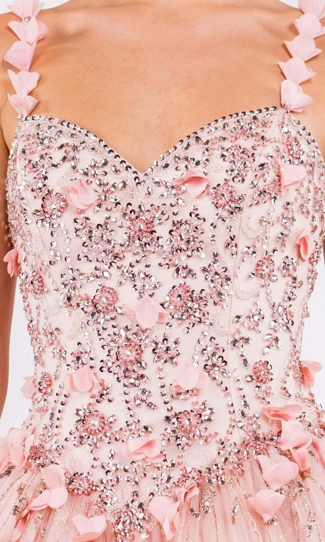| Details: | Ornate Spaghetti Strap, 3D Florals, Appliques, Beads, Glitter, Jewels, Sequins, Corset Back, Sweep Train |