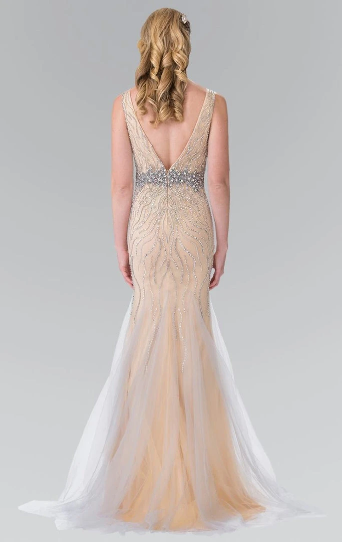 You will always be in style in this Elizabeth K GL2344 design. V-neckline in front and back flatters your alluring skin. Clustered beads belted the waist and scattered all over the mermaid silhouette. Look remarkable for the party in this Elizabeth K style.