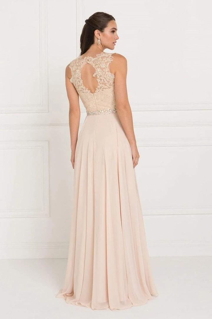 Make them turn their heads as you make an impression in this daintily adorned Elizabeth K GL2417 creation. Intricately embellished with tonal floral lace festooned with glimmering rhinestones, this exquisite piece shows a jewel illusion over a sweetheart neckline and a keyhole cutout sheer back. Ornamented with faceted crystals along the natural waist, the skirt flutters with soft chiffon as it streams elegantly down to a full-length A-Line hemline. Dance all night long in impeccable flair in this dreamy Elizabeth K masterpiece.