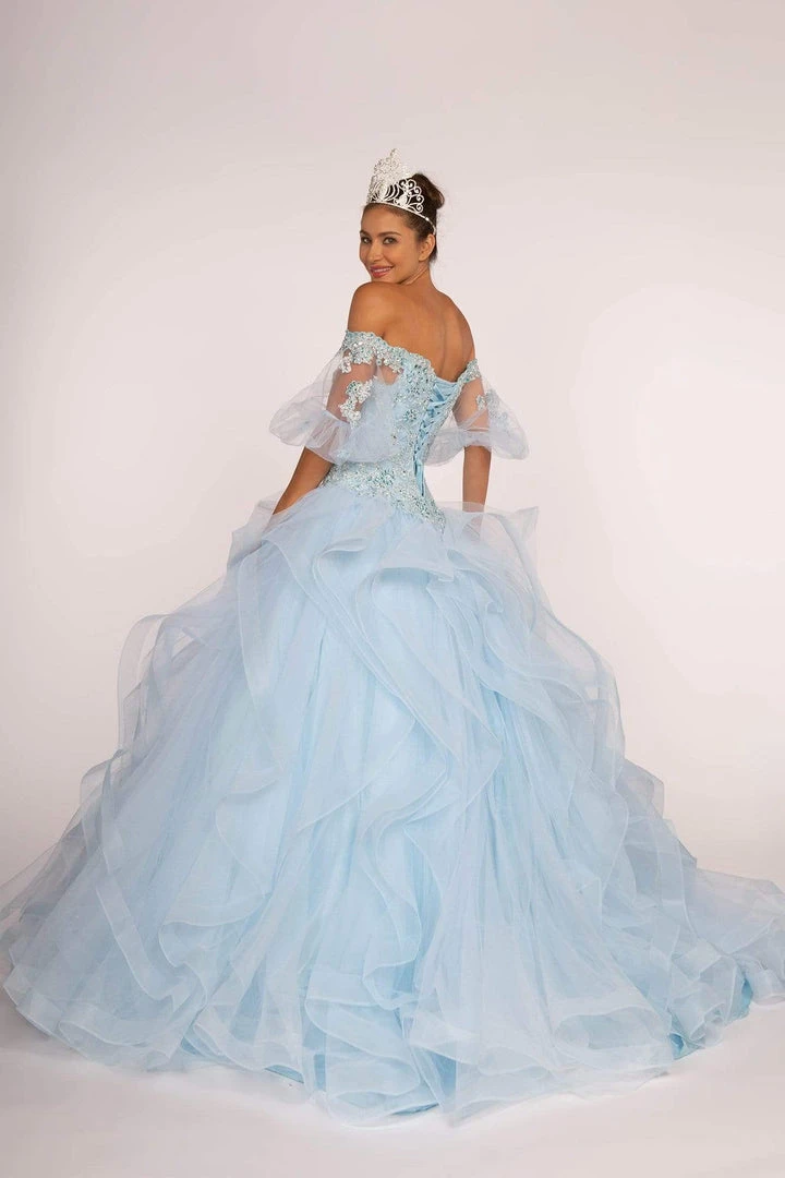 Bring out the princess in you when you wear this lovely masterpiece by Elizabeth K GL2601. Striking beaded appliques beautify the fitted bodice framed with an off-shoulder neckline and sheer puffed sleeves complemented with mid-open laced up back. From the basque waist reveals a tulle ballgown skirt with fabulous ruffles that drop down the floor finished in horsehair hemline. You are certain to have a magical night when you don this Elizabeth K ensemble.