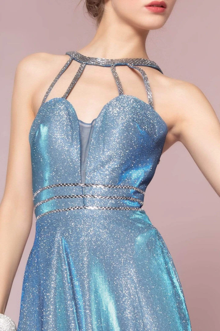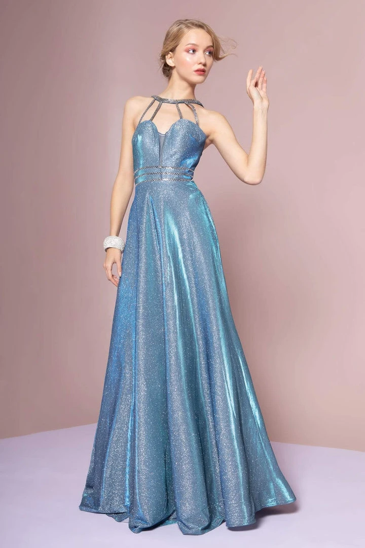 Proceed in confidence with Elizabeth K GL2672. This glitter crepe creation envisions in a sleeveless, high neckline with alluring cutouts. The fitted bodice is wrapped in triple embellished bands and has a back zipper closure. The skirt opens in a full length A-line silhouette and is designed with side pockets for convenience. This fabulous design by Elizabeth K brings a striking look meant to turn heads.