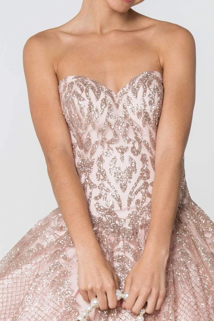 Shine all night as you wear this grandiose Elizabeth K GL2806 masterpiece. Glamorously tailored in glitter mesh, this stellar piece features a fitted bodice framed with a strapless sweetheart neckline and Basque waist. The ballgown skirt highlights wonderful pleats that cascades to the floor, completed with a small train. The back is mid-open secured with lace up closure for an adjustable fit. Brave the evening with temptress beauty and grace wearing this sparkling Elizabeth K ensemble.